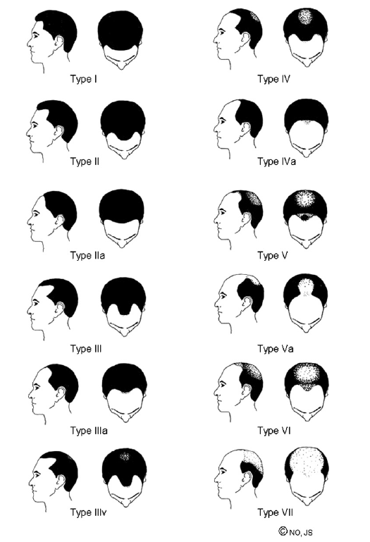شکل 1. طبقه بندی نوروود همیلتون در مورد ریزش موی آندروژنتیک. (Courtesy of Nina Otberg, MD, and Jerry Shapiro, MD, Vancouver, British Columbia, Canada)